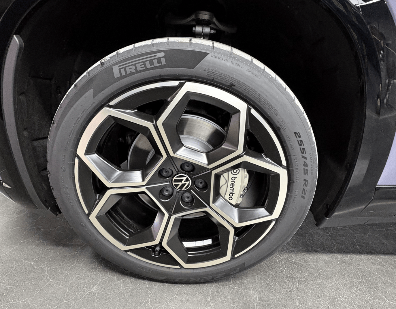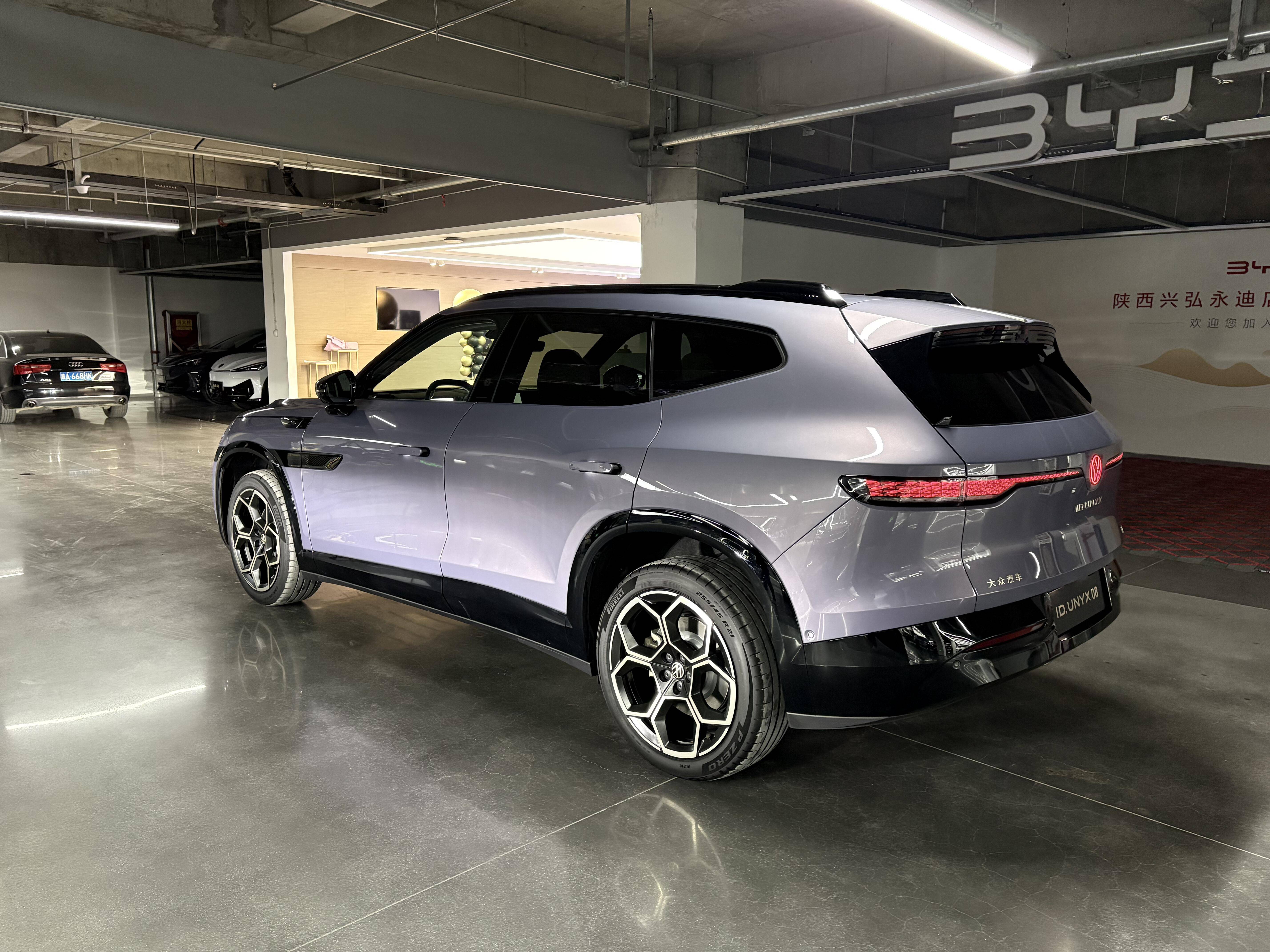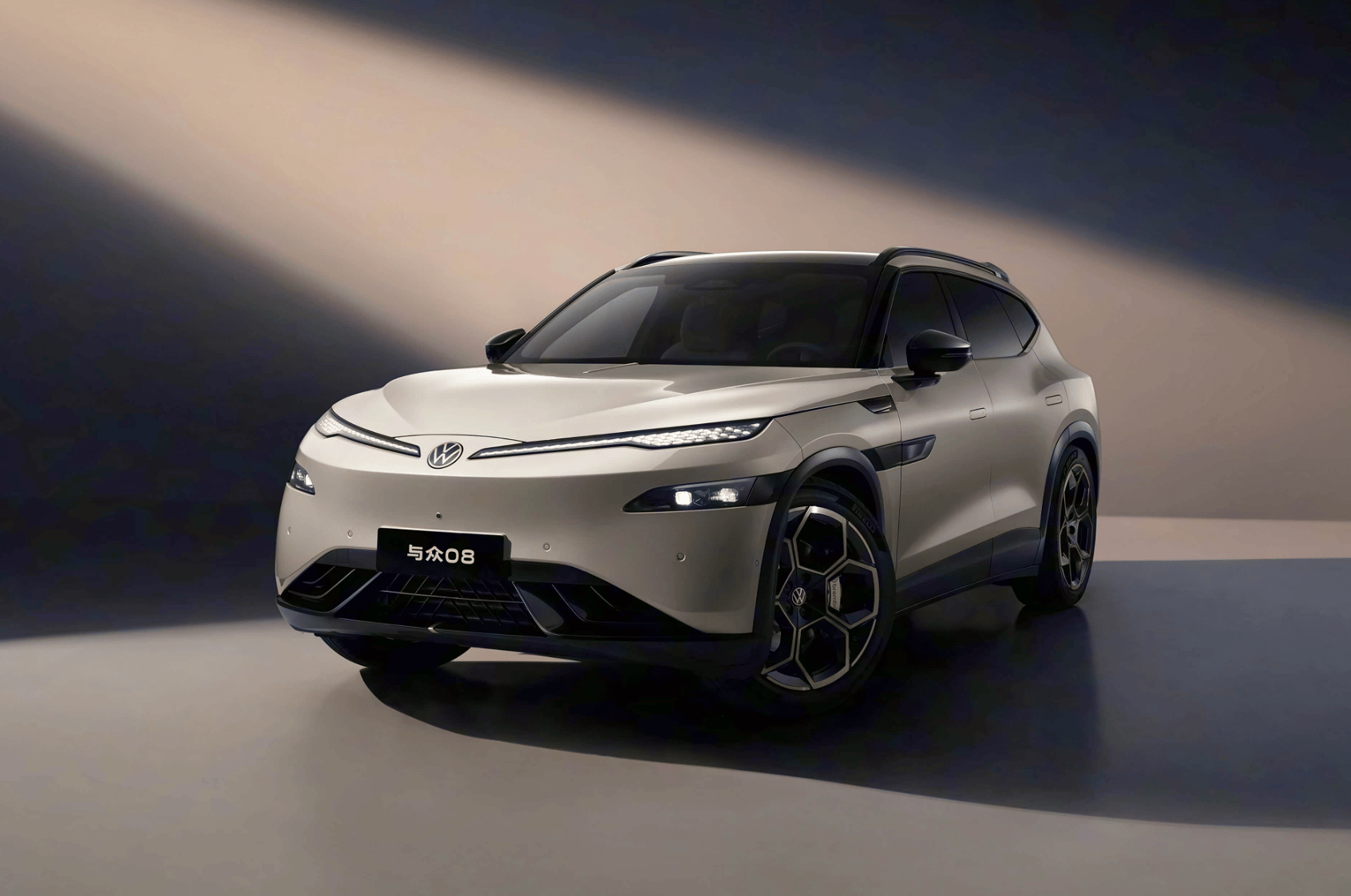 车身尺寸长宽高分别为5000/1954/1688mm,轴距3030mm,大过同级小鹏G9、小米YU7、智界R7等。车身侧面采用饱满且动感的姿态,并配备悬浮式车顶、无框车门、隐藏式门把手、21英寸足球风格轮毂+4活塞布雷博卡钳等。尾部晶耀点阵尾灯聚焦中间金色“VW”发光logo,与前脸相呼应,而且还将采用贯穿式“狼标”高位刹车灯。而大面积熏黑后包围配合扰流板,继续强调运动感。