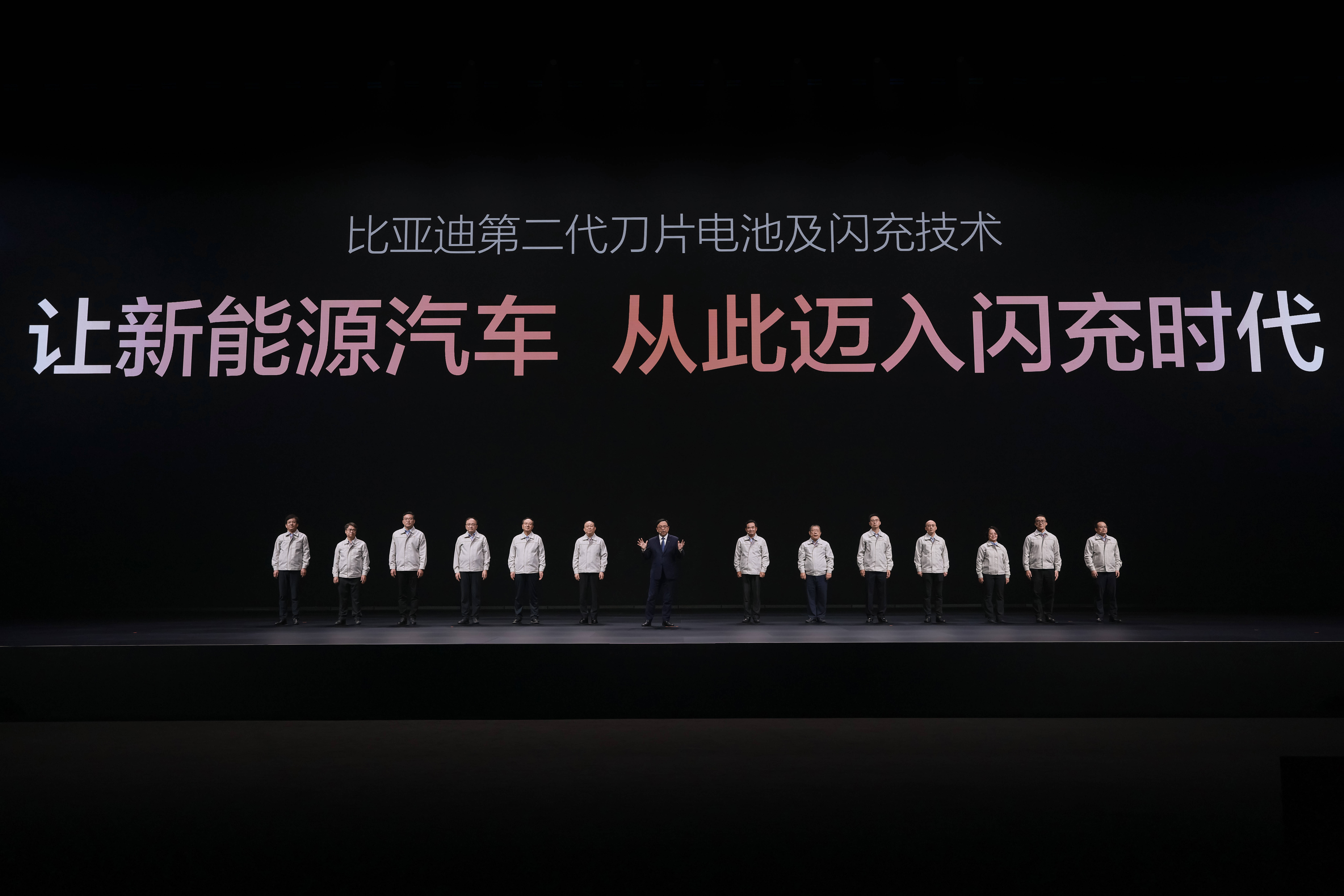 持续技术创新,解决社会痛点,满足用户需求,背后是比亚迪工程师文化、持续研发投入的支撑。比亚迪13位工程师代表上台,王传福与其一一握手、致谢,然后是一个全体喊口号的环节: